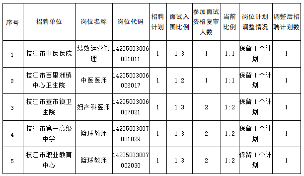 根据面试资格复审情况,以下5个岗位因考生放弃面试资格且无人再递补,经招聘单位申请及其主管部门同意,适当降低开考比例或不设开考比例。具体岗位如下: