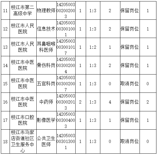 根据报名、笔试成绩情况,共有18个岗位计划招聘人数与参加笔试人数未达到规定比例。经招聘单位及其主管部门申请,市招聘工作领导小组批准,相关岗位招聘计划予以核减、取消或者降低面试入围比例保留。具体岗位如下: