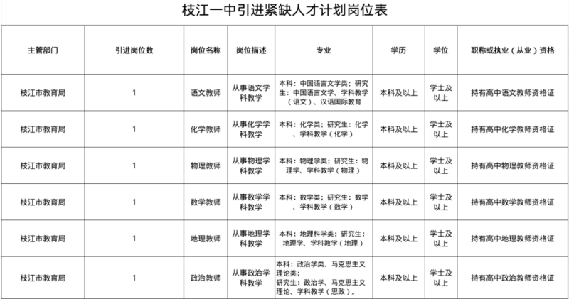 为进一步加强人才队伍建设,优化人才队伍结构,根据《关于印发<枝江一中振兴行动人才招引激励办法>的通知》(枝人办文〔2023〕号),结合枝江市第一高级中学岗位空缺情况及工作需要,拟在近期开展人才引进工作,现公告如下: