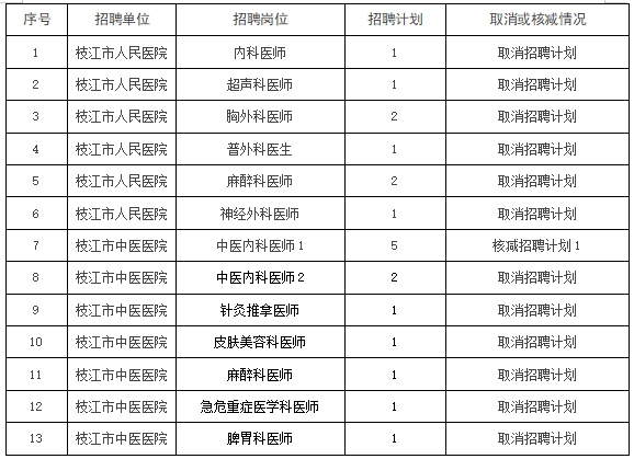 因相关岗位无人报考、缺考、第一轮面试成绩未达到80分、第二轮面试成绩未达到最低合格分数线,枝江市2025年“招才兴业”卫生健康系统事业单位人才引进校园招聘·华中科技大学同济医学院站需取消或核减招聘计划,具体情况见下表。