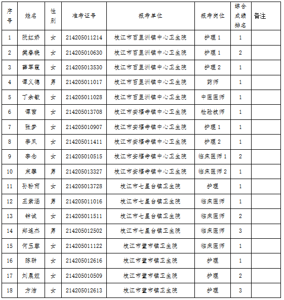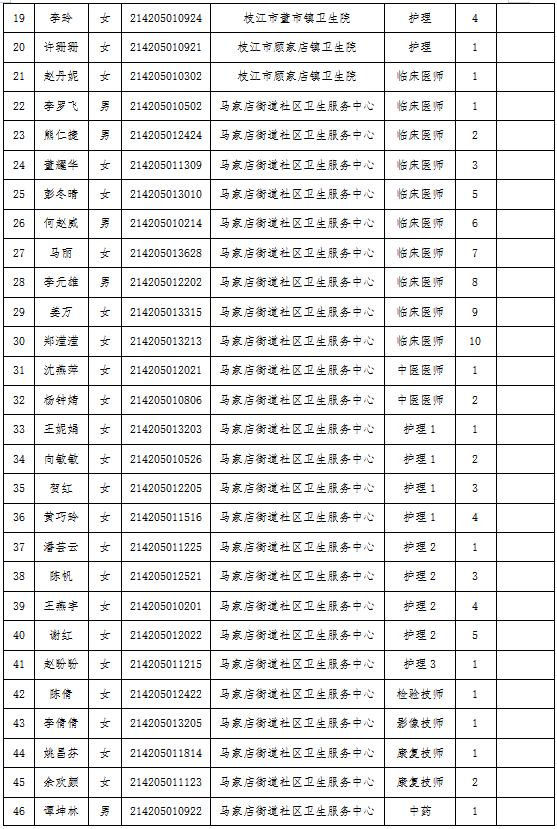 根据《2021年湖北省基层医疗卫生专业技术人员招聘公告》规定,经公开报名、资格审查、笔试、面试、体检和考察等程序,现将2021年枝江市基层医疗卫生专业技术人员招聘拟聘用人员予以公示。